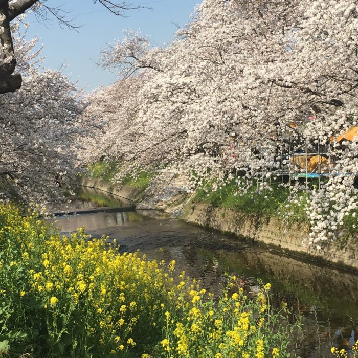 五条川の水面にうつる、桜の花のピンクと川の土手の菜の花の黄色が 何とも春らしい良い感じの色合いでした。