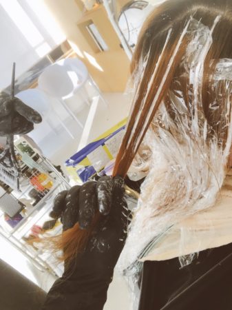 ほうきで掃くという意味なのですがほうきっぽいハケを使い、さっさっさと自然にグラデーションがつくように薬剤をのせていきます!
