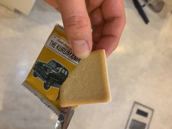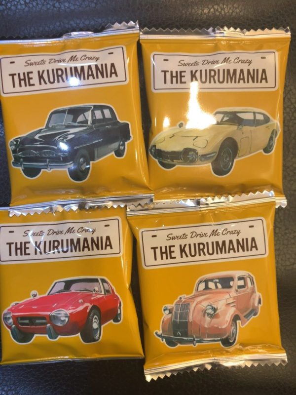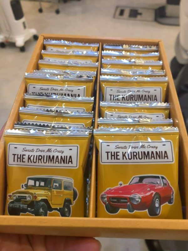 レトロな車の写真がのってるパッケージがずらっと並んでます! 2000GT、クラウン、ランドクルーザーなど レトロなんですが、今みてもカッコいい車ばかりです。 中には、美味しそうなメープルバタークッキーがはいってます! サクサクなクッキーの食感の中に、メープルの香りとチョコレートの甘さが美味しかったです!!